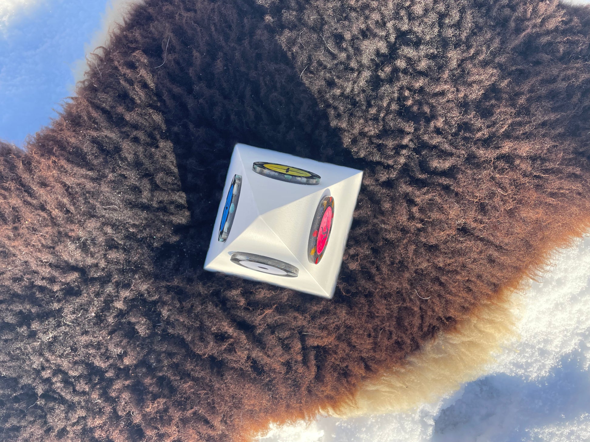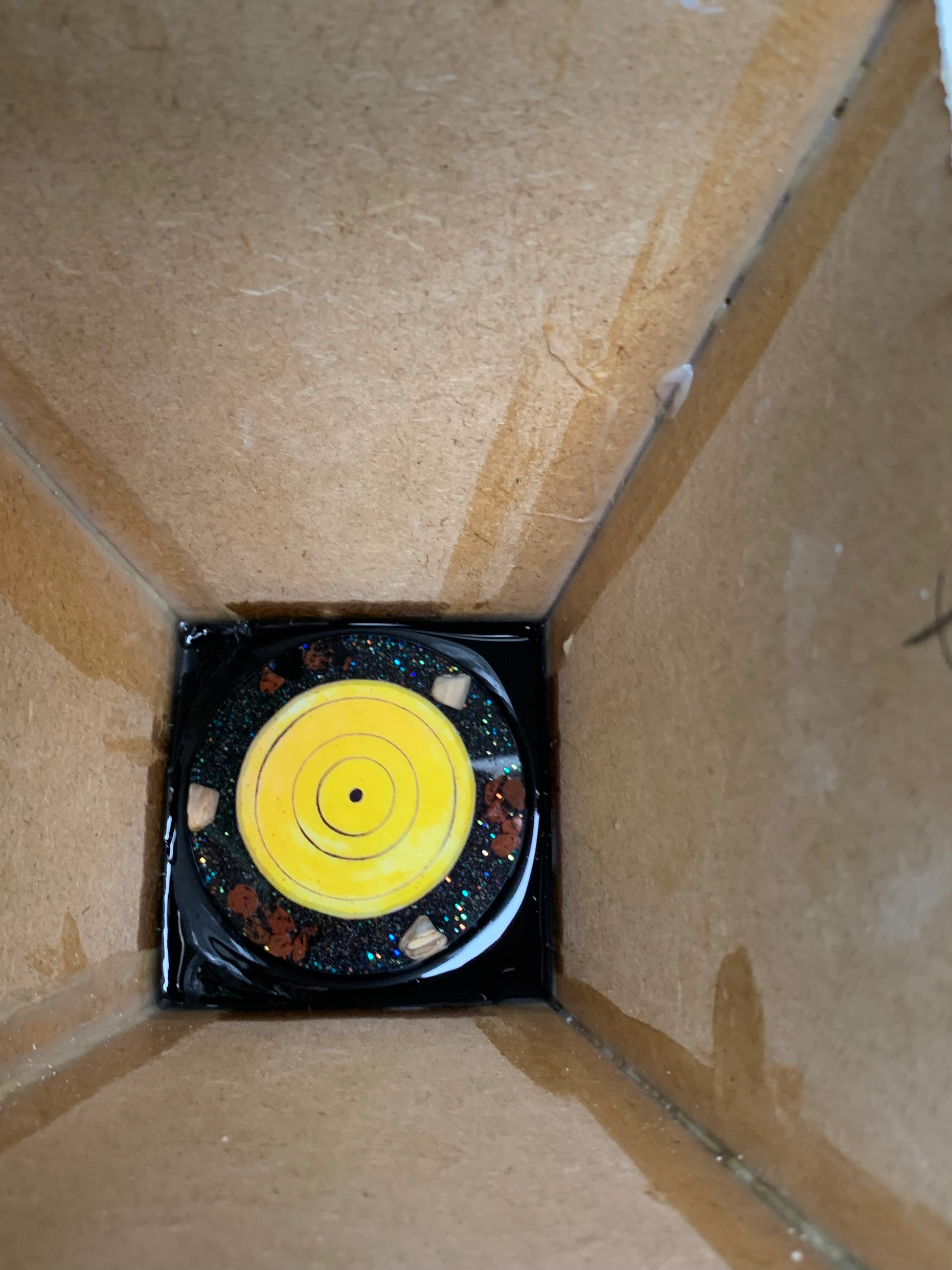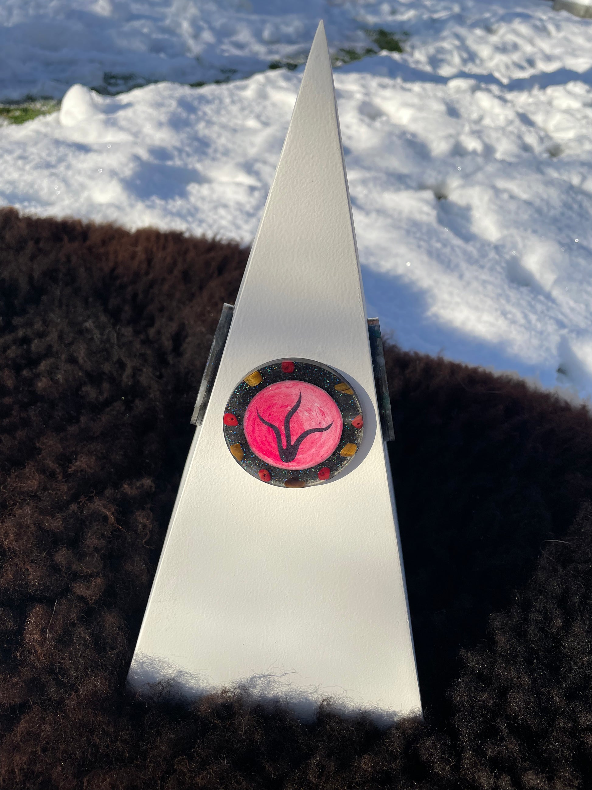 De kern van de piramide bevat een krachtige orgonite die specifiek is afgestemd op energetische bescherming en transformatie. Deze orgonite bestaat uit: