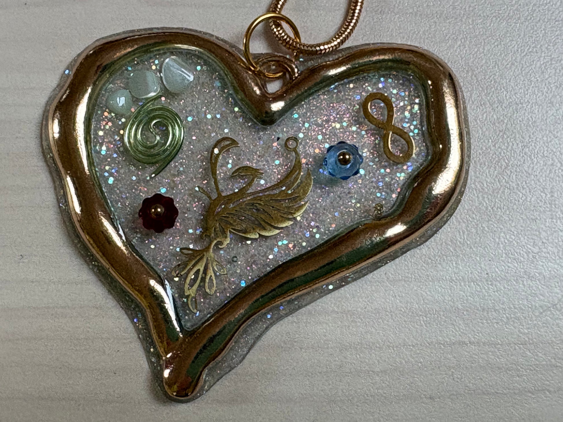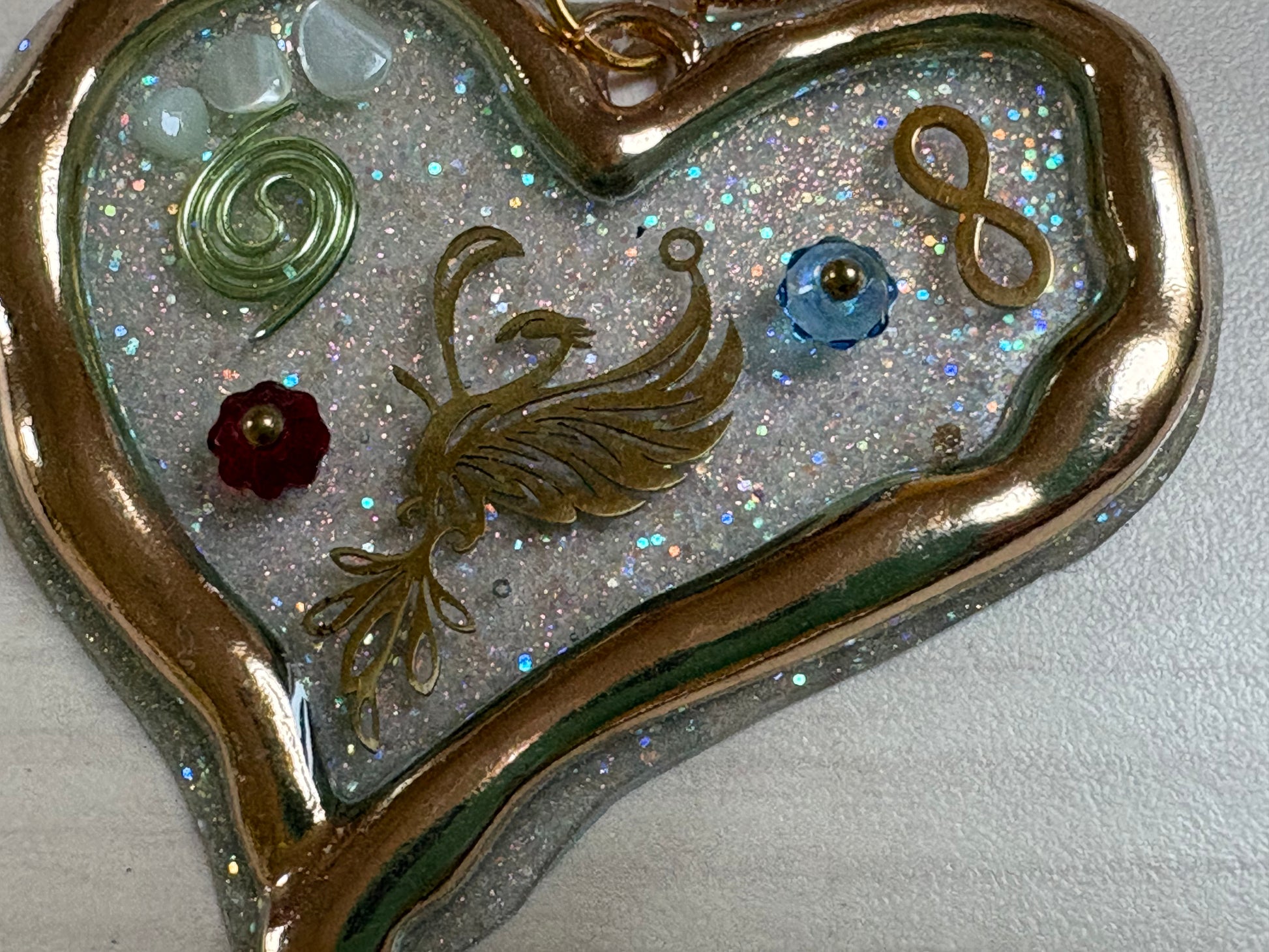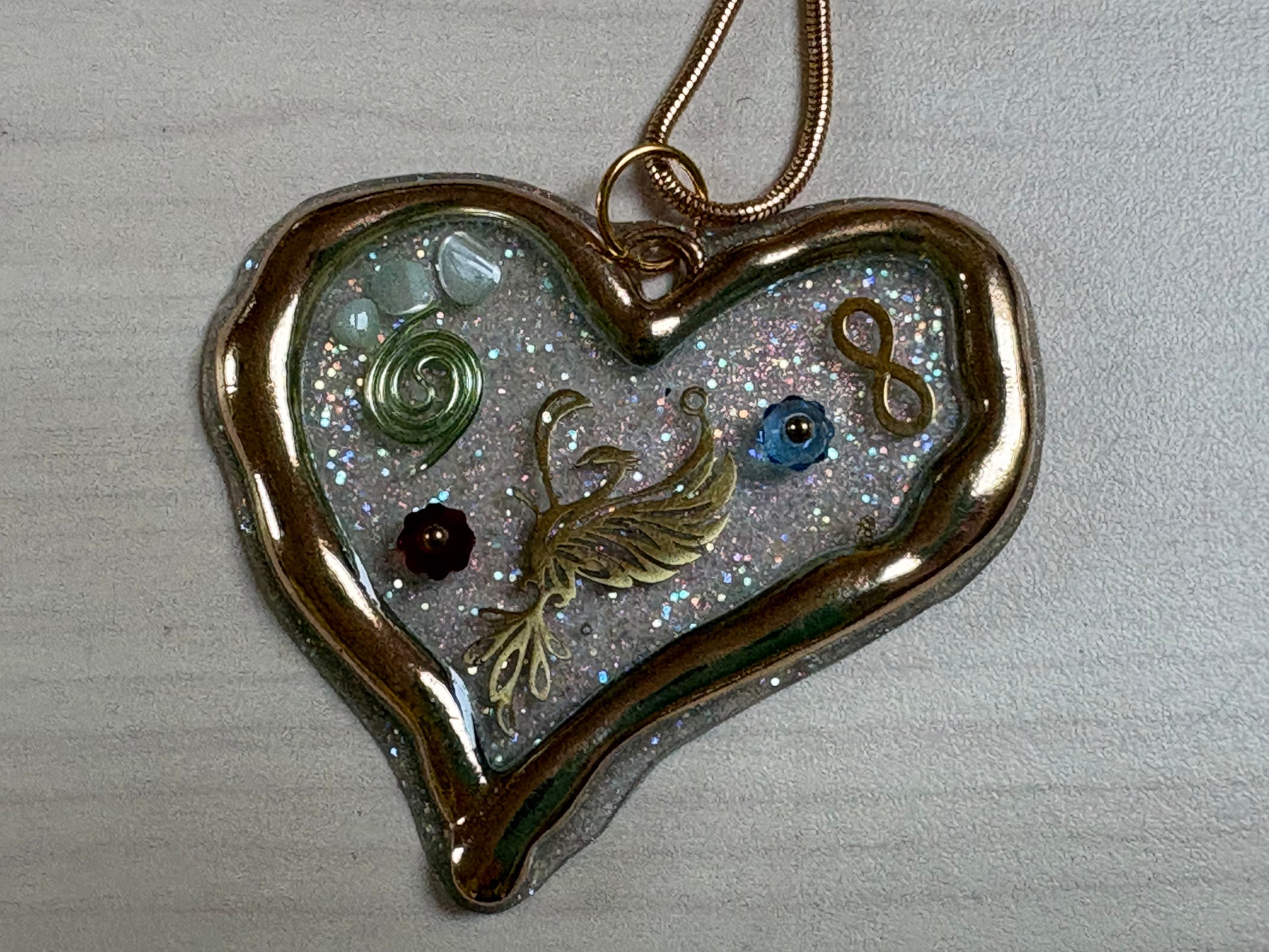 De Eeuwig hart feniks is een hartvormige orgonite hanger die kracht, transformatie en oneindige verbondenheid uitstraalt. In het centrum rijst een sierlijke Fenix op, symbool voor nieuw begin en innerlijke kracht. Het infinity-teken en de vortex versterken een continue stroom van energie en balans. Permutt en een fonkelend Swarovski-kristal geven de hanger een zachte, magische glans en versterken zijn beschermende uitstraling. Deze bijzondere hanger is ontworpen om je aura te verhelderen, je hart te openen en je pad van groei en transformatie te ondersteunen.