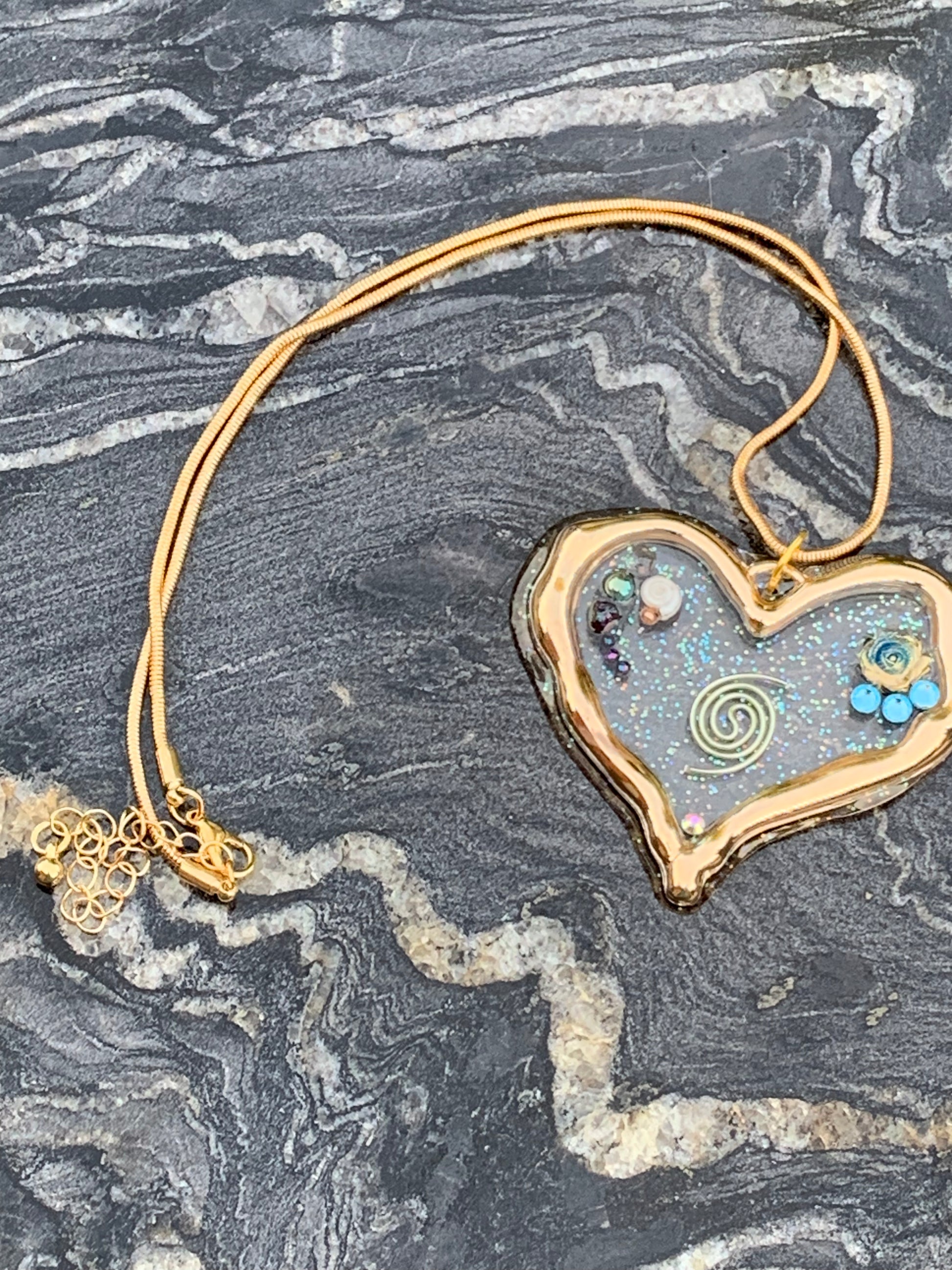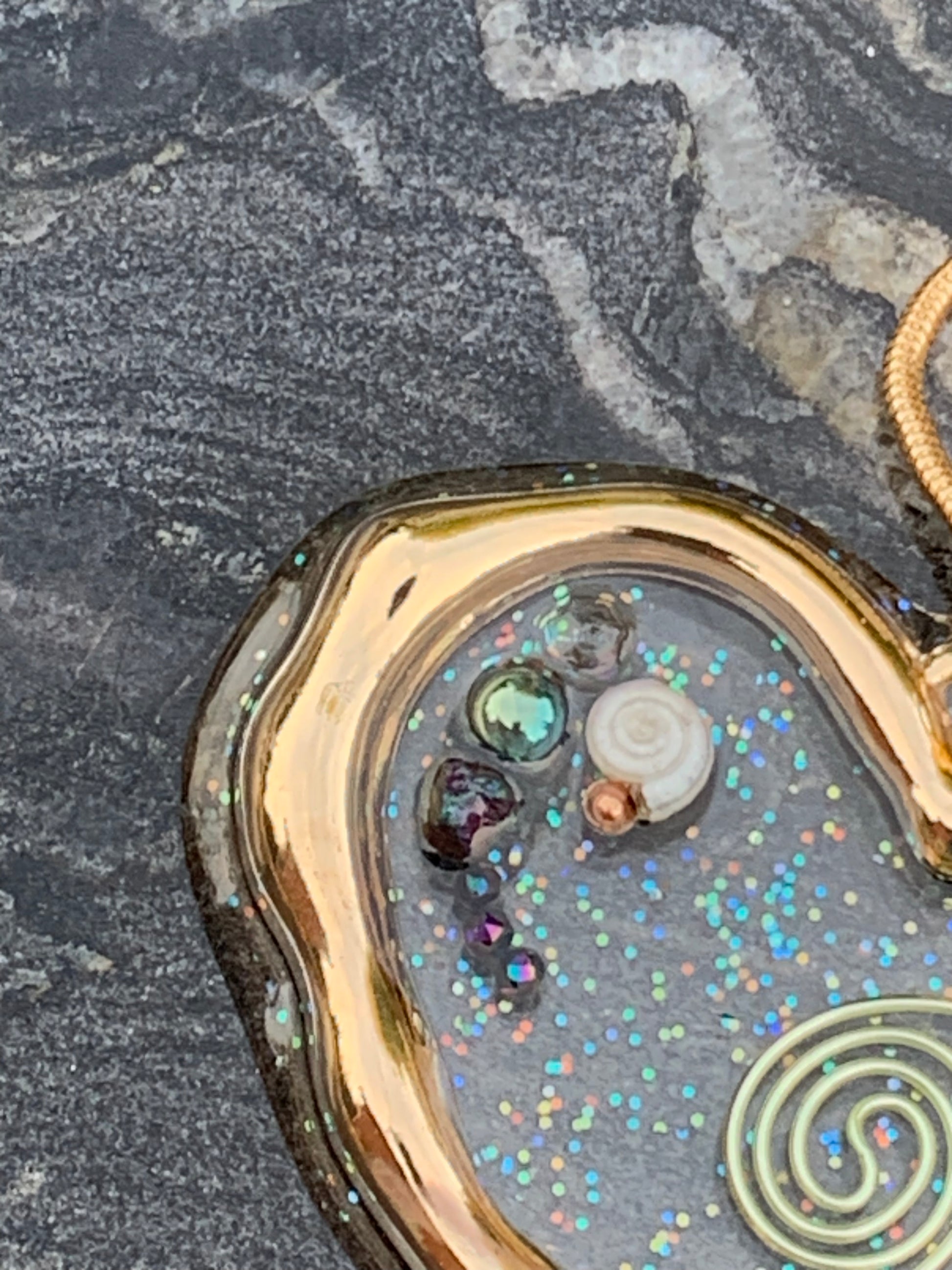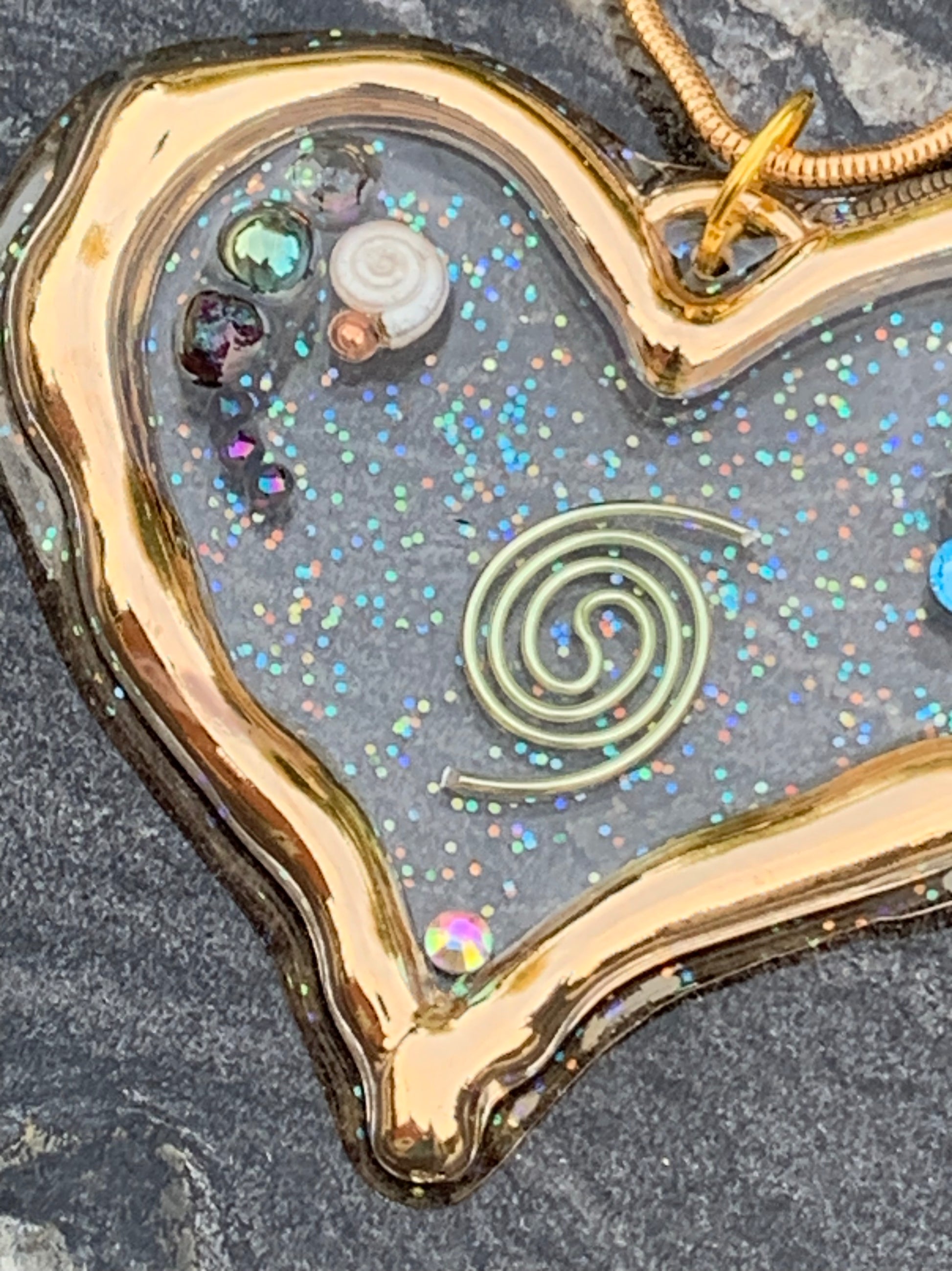 Dit hartvormige orgonite juweel straalt pure lichtkracht uit. De ene zijde, met aqua aura, titanium kwarts en regenboog hematiet, versterkt energie, vreugde en bescherming. In het midden stroomt een krachtige vortex, die balans en doorstroming brengt. De andere zijde toont een delicate bloem met drie fonkelende Swarovski kristallen, symbool voor schoonheid, harmonie en zielsgroei. Een uniek sieraad dat innerlijke kracht en licht met elkaar verbindt.