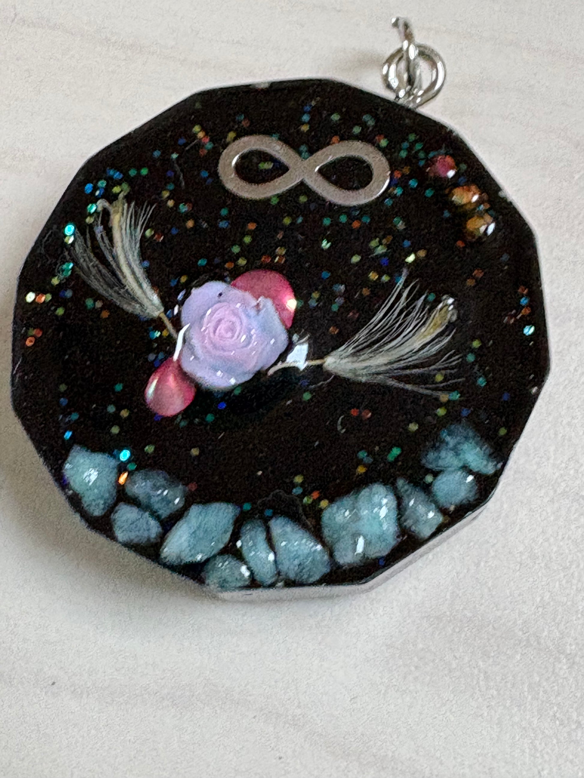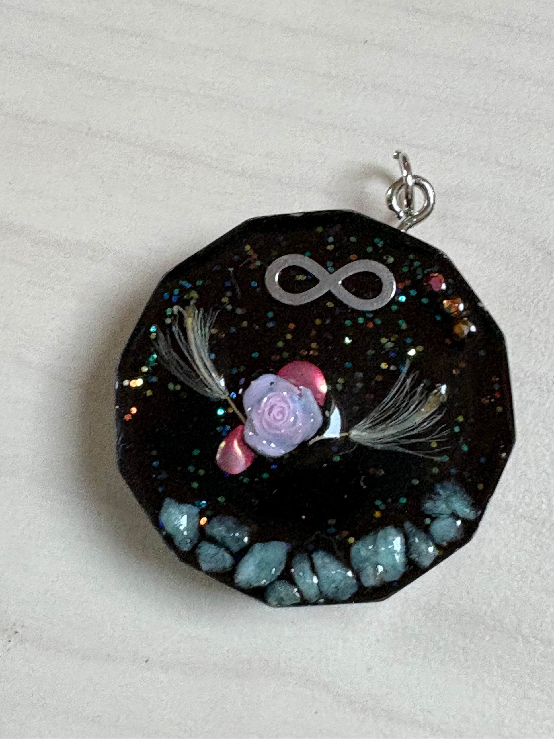 Deze unieke orgonite-hanger combineert Azumar voor zachte, kalmerende energie met Titaniumkwarts dat kracht, vitaliteit en kleurvolle vibratie toevoegt. In het midden bevindt zich het infinity-teken, symbool van oneindige stroming en balans. De hanger is gegoten in edelshungiet, bekend om zijn sterke beschermende en zuiverende eigenschappen, terwijl koper zorgt voor optimale energetische geleiding. Samen creëren ze een krachtig, harmoniserend sieraad dat zowel beschermt als versterkt.