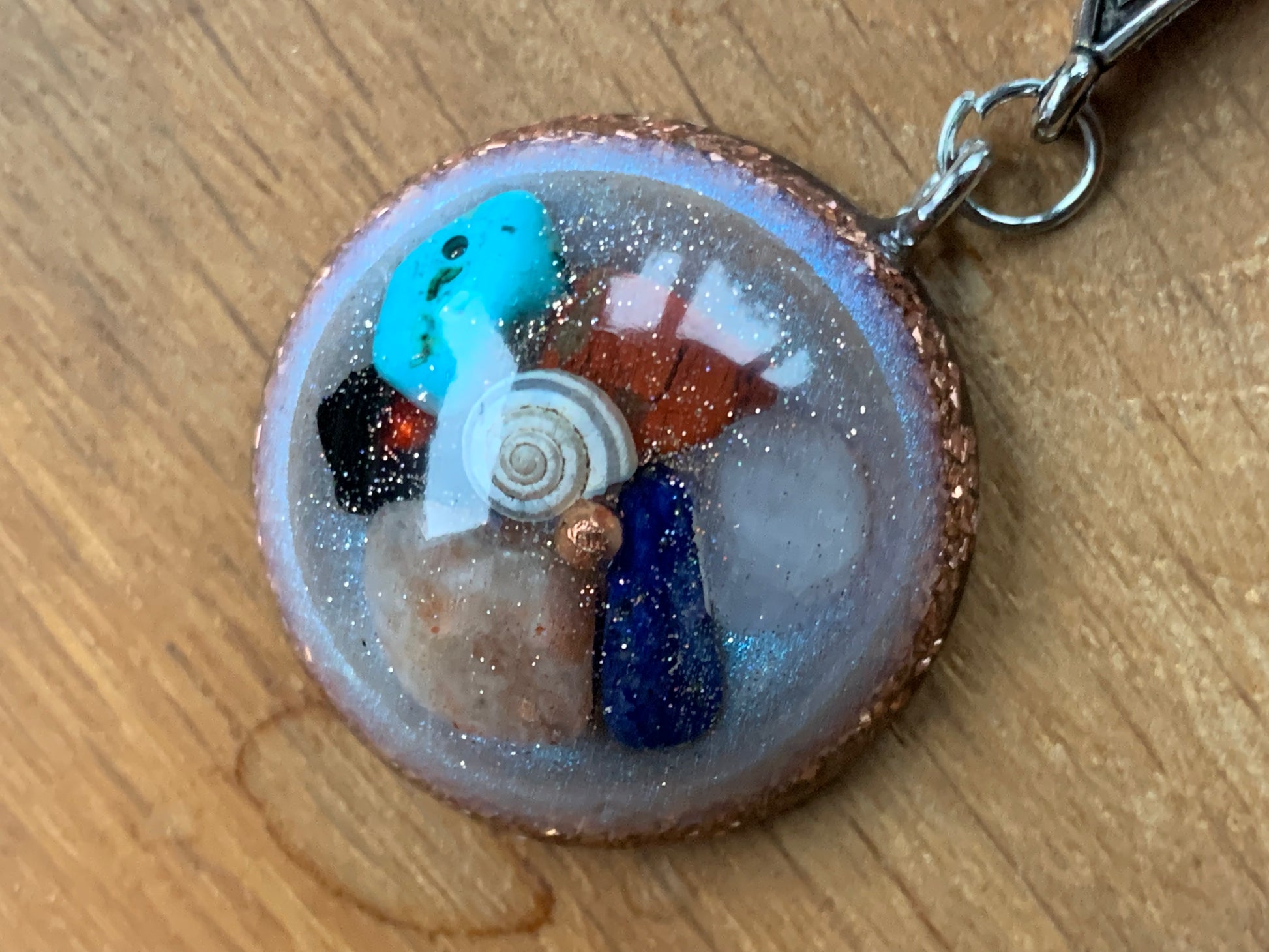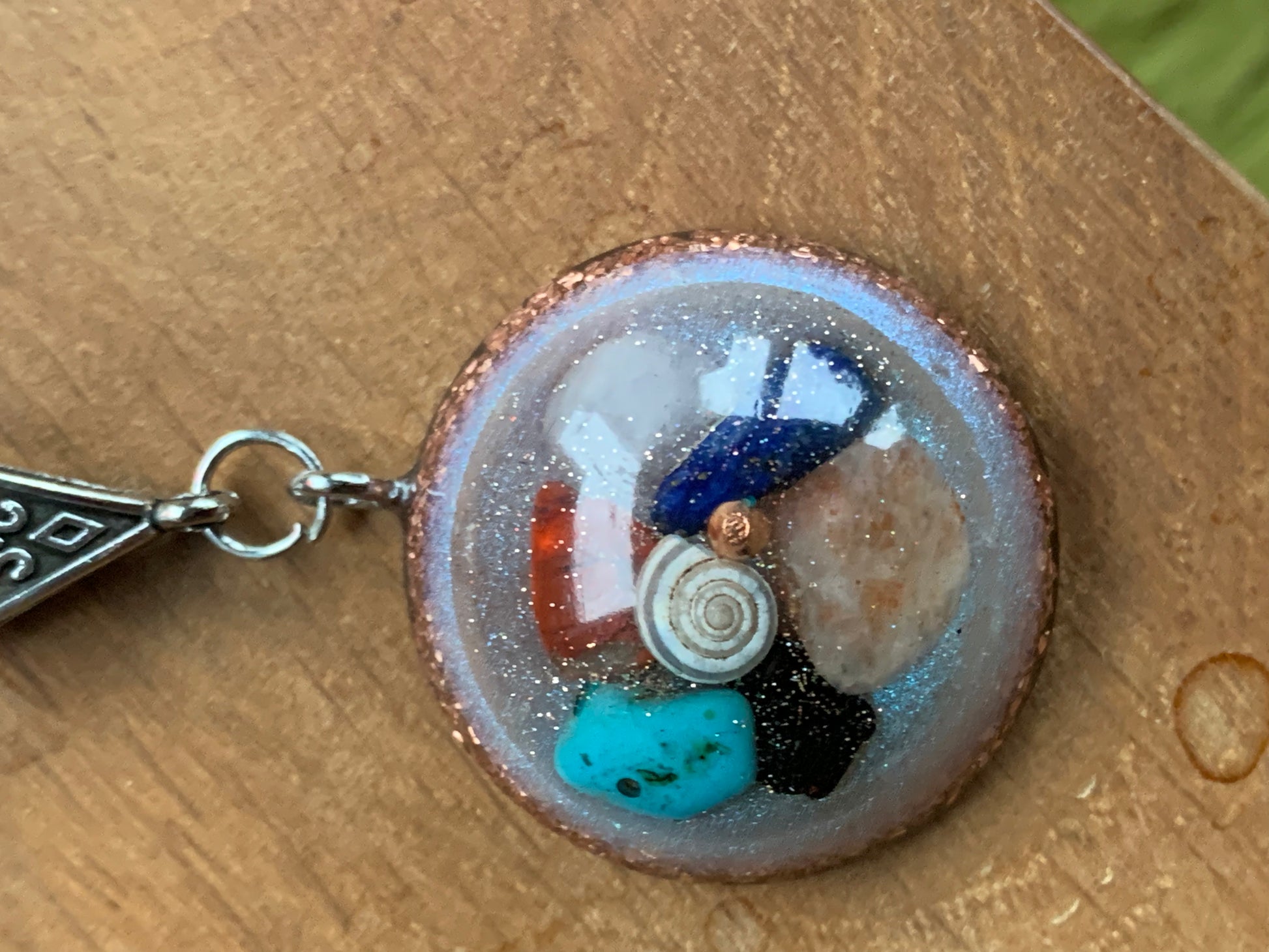 Dit orgonite juweel is ontworpen om balans, harmonie en bescherming in je leven te brengen. De zorgvuldig gekozen materialen versterken elkaar en creëren een krachtige energie die je aura zuivert en stabiliseert. Het juweel bevordert innerlijke rust en helpt negatieve invloeden af te weren. Een elegant sieraad dat zowel energetisch als esthetisch een verrijking is.