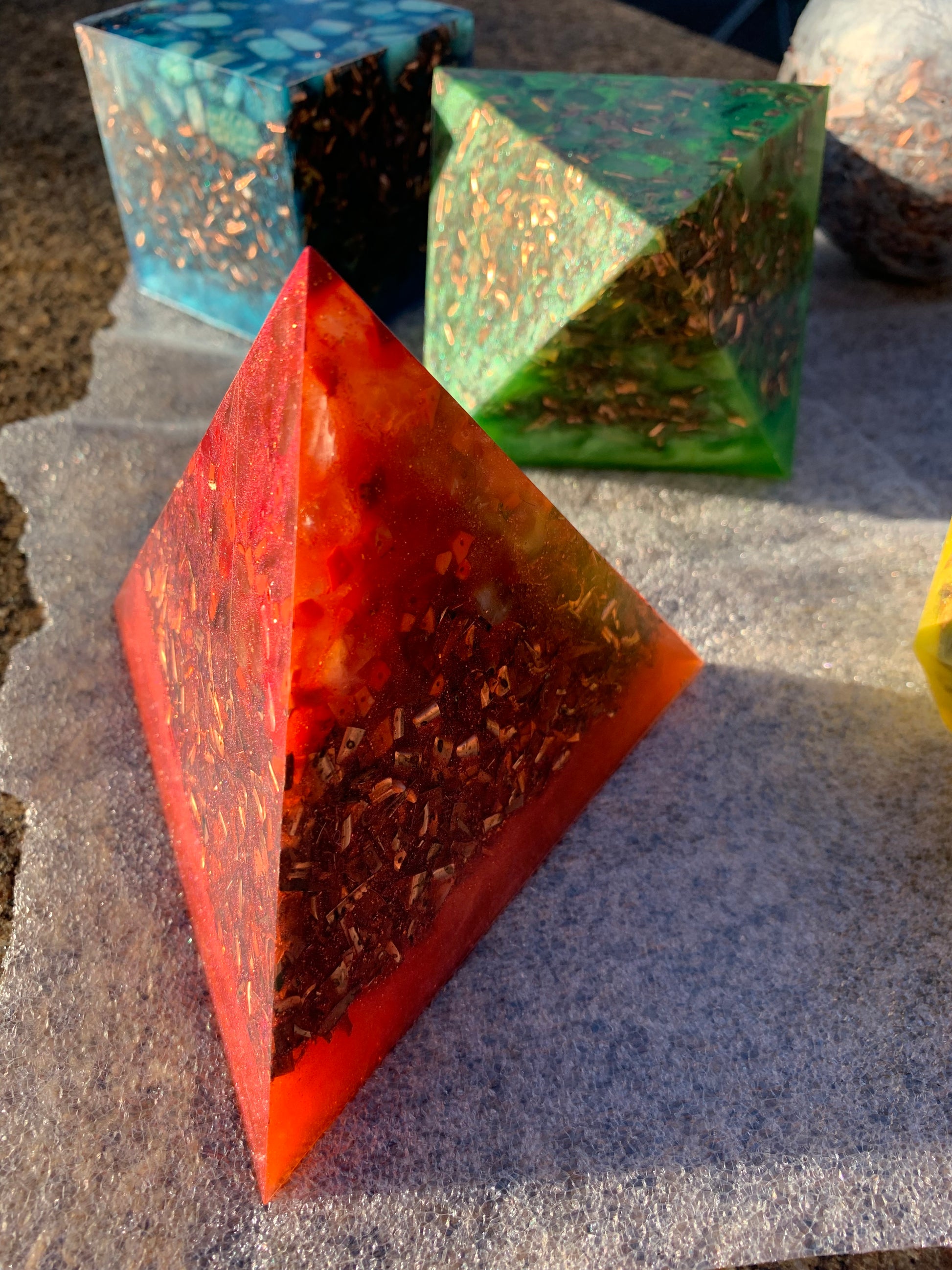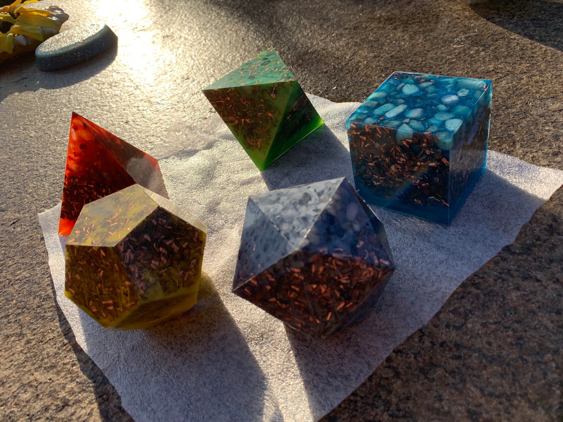 Deze set orgonite , is geassocieerd met de vijf elementen in de Oosterse filosofie, namelijk aarde, water, vuur, hout en metaal. Elke orgonite is samengesteld met edelstenen die resoneren met een specifiek element om de energetische eigenschappen te versterken. Een orgonite met aarde-element edelstenen kan bijvoorbeeld helpen om je te aarden en verbinding te maken met de natuurlijke wereld. Een orgonite met water-element edelstenen kan helpen bij het bevorderen van emotionele genezing en intuïtie. Een orgonite met vuur-element edelstenen kan helpen bij het versterken van je wilskracht en passie. Een orgonite met metaal-element edelstenen kan helpen bij het bevorderen van communicatie en mentale helderheid. Een orgonite met hout-element edelstenen kan helpen bij het bevorderen van spiritualiteit en verbinding met het goddelijke.