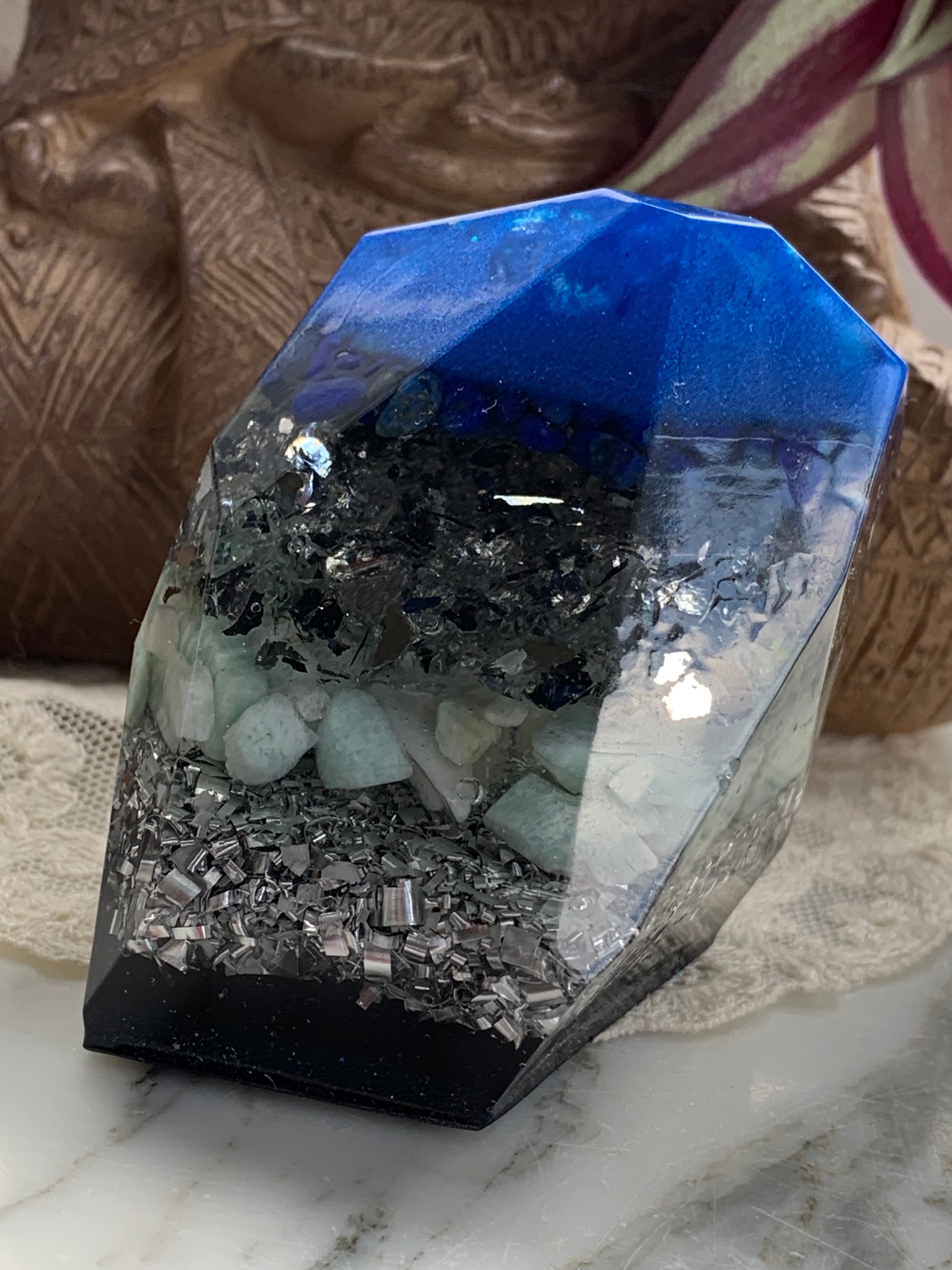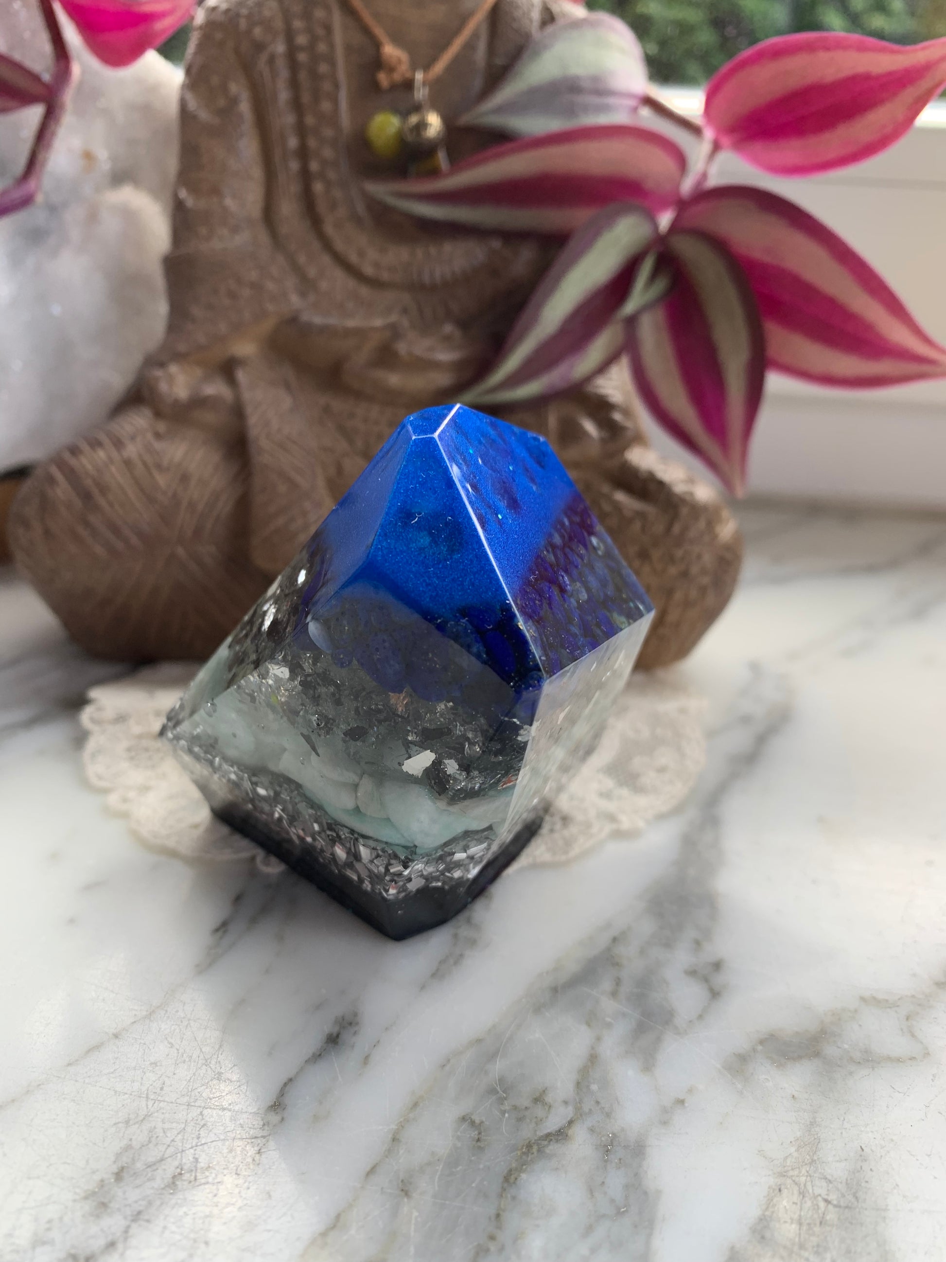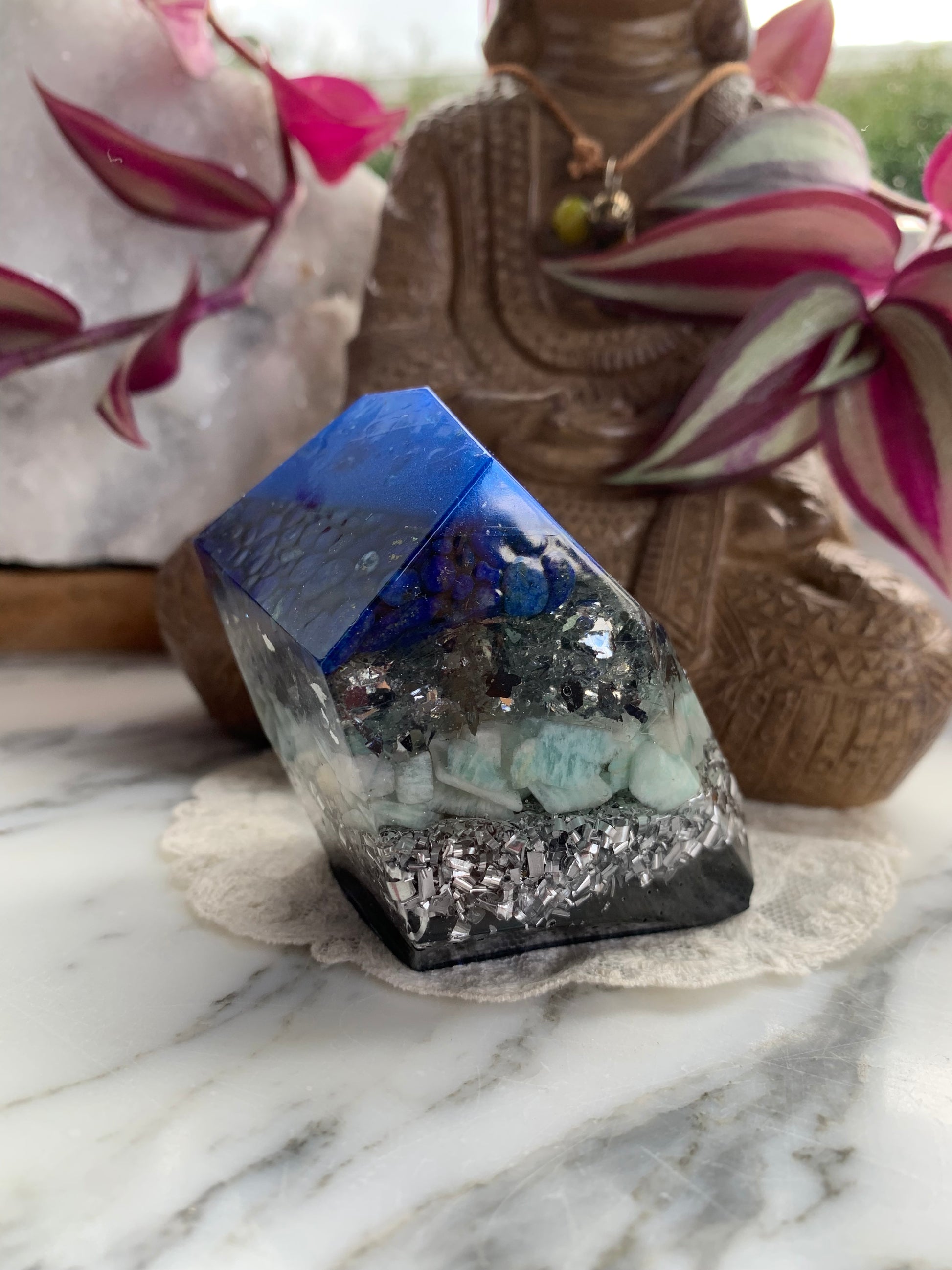 De krachtige orgonite, ruw en vol energie, omvat bergkristal dat schittertin de top, vergezeld door de diepblauwe pracht van lapis lazuli en de beschermende energie van spiegelglas, dat negativiteit reflecteert en transformeert. De levendige amazoniet voegt een vleugje natuurlijke vitaliteit toe, terwijl aluminium als metaalverbinding de energie optimaliseert. Ondersteund door de aardse kracht van shungiet en de zuiverende eigenschappen van toermalijnkwarts, vormt deze orgonite een harmonieuze en beschermende aanvulling op elke omgeving.
