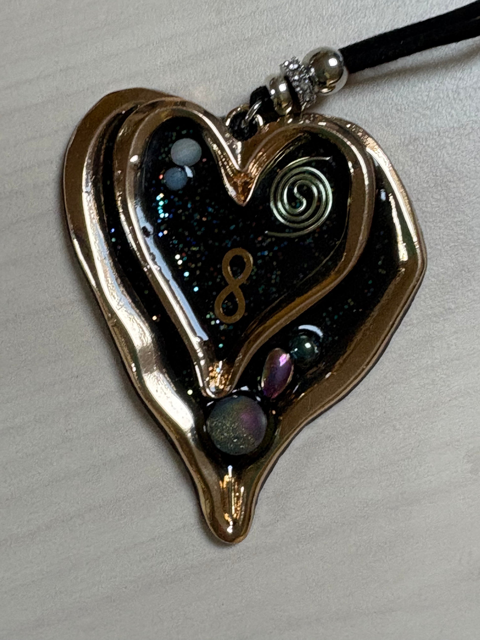 Deze bijzondere orgonite hanger is gegoten in edel shungiet en verrijkt met aqua aura, titanium kwarts, druzy agaat en aquamarijn waardoor het een krachtige energetische werking heeft. De spiraal vortex versterkt de bescherming en bevordert een diepe spirituele connectie. Het infinity teken staat symbool voor oneindige mogelijkheden en tijdloze energie. Deze hanger biedt een perfecte balans tussen aardse stabiliteit en kosmische krachten, ideaal voor bescherming, transformatie en spirituele groei.