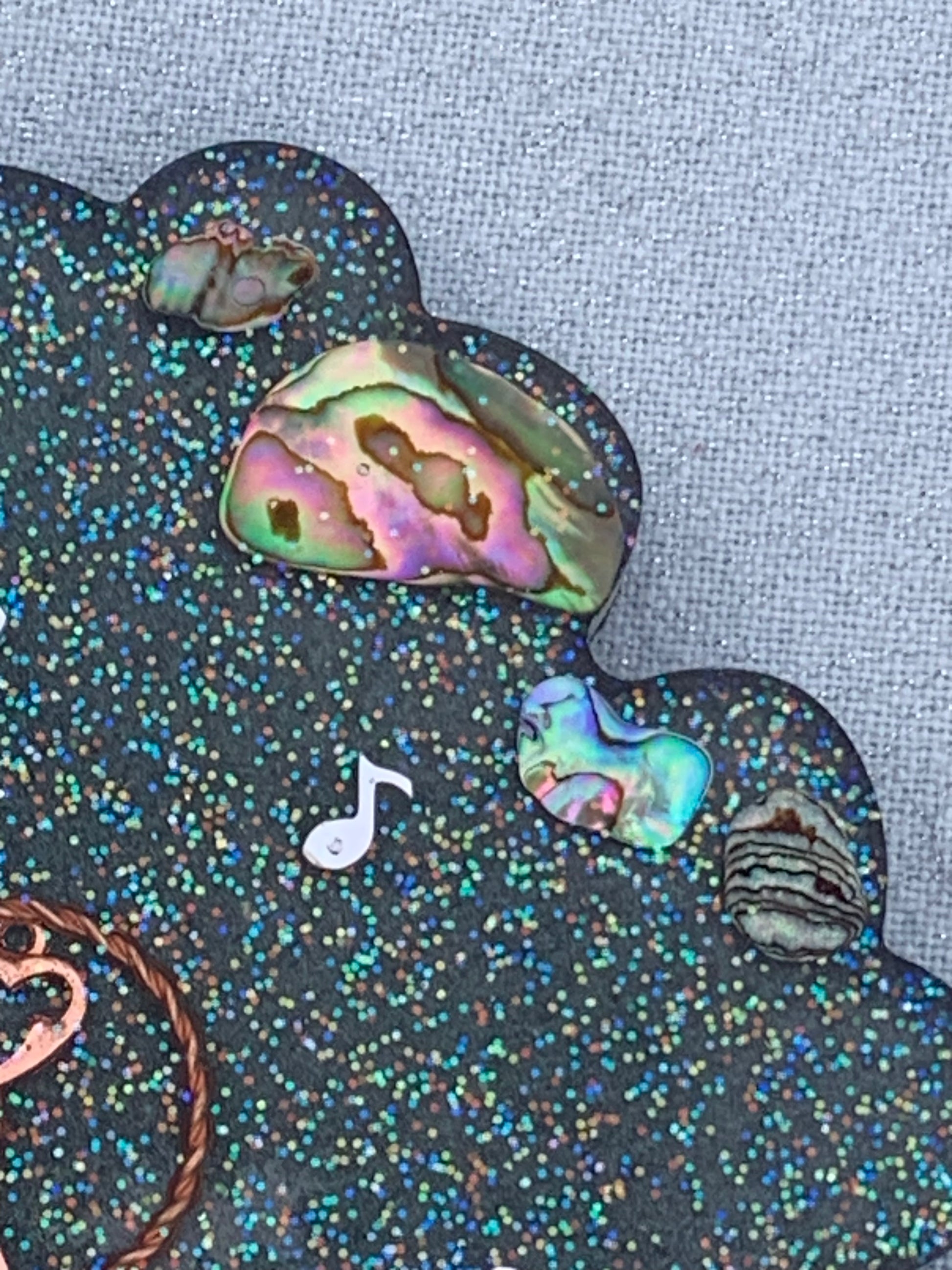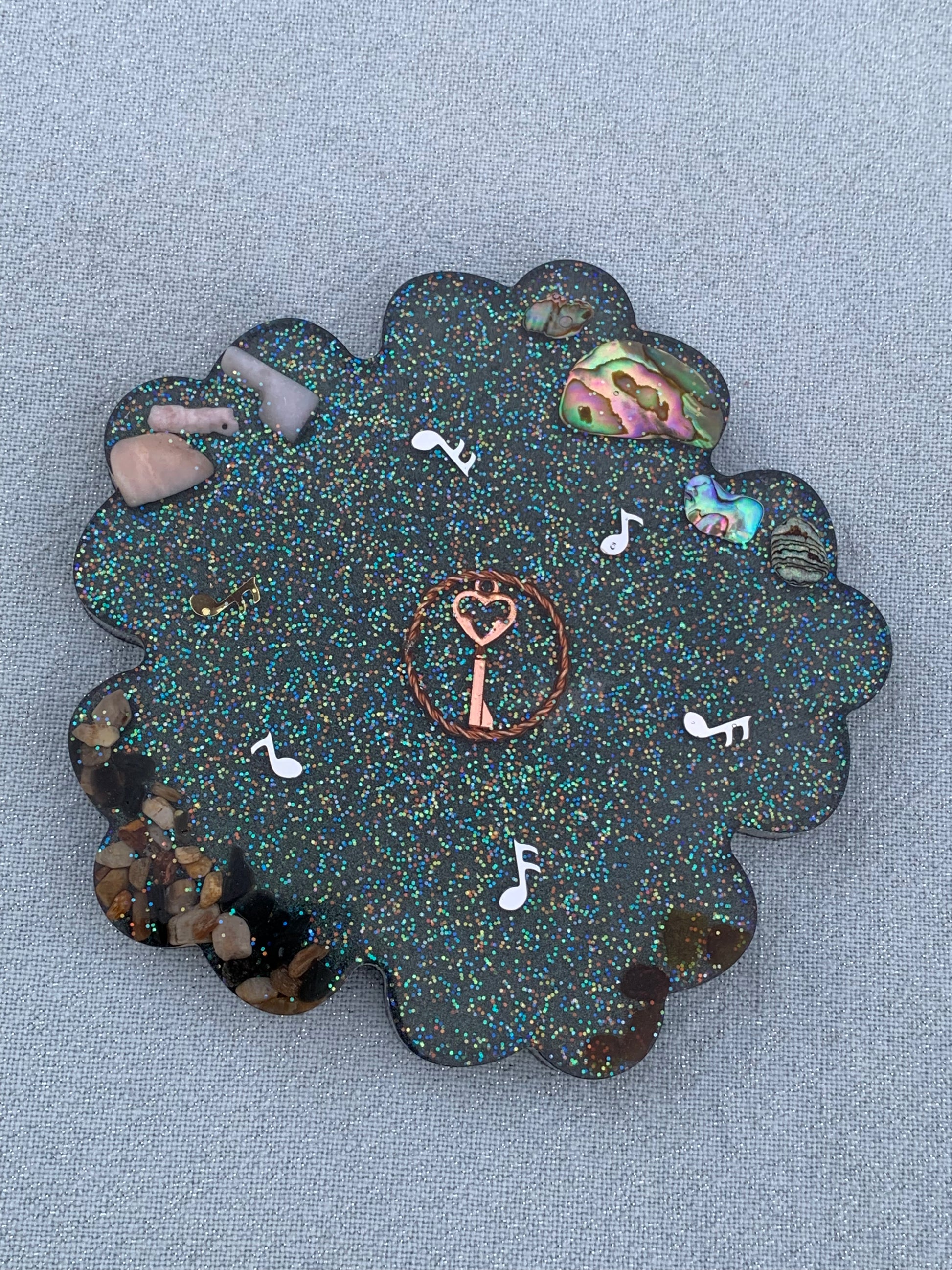 Deze orgonite oplaadschijf in bloemvorm draagt een zachte energie en is ontworpen om kracht en rust te bundelen. Abalone shell brengt verbinding met intuïtie en de zee van emoties, terwijl versteend hout en shungiet aarden en beschermen tegen negatieve invloeden. Roze opaal opent het hart en verzacht emoties, en barnsteen schenkt warmte en levenskracht. In het midden ligt een sleutel, omgeven door een manifestatie-tensorring, die de intentiekracht versterkt en richting geeft. De shungiet eindlaag sluit het geheel af met een beschermende, stabiliserende energie.