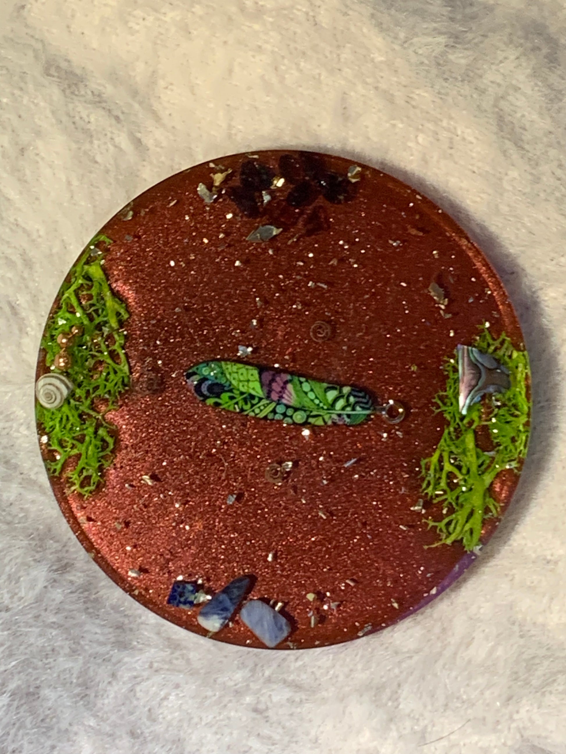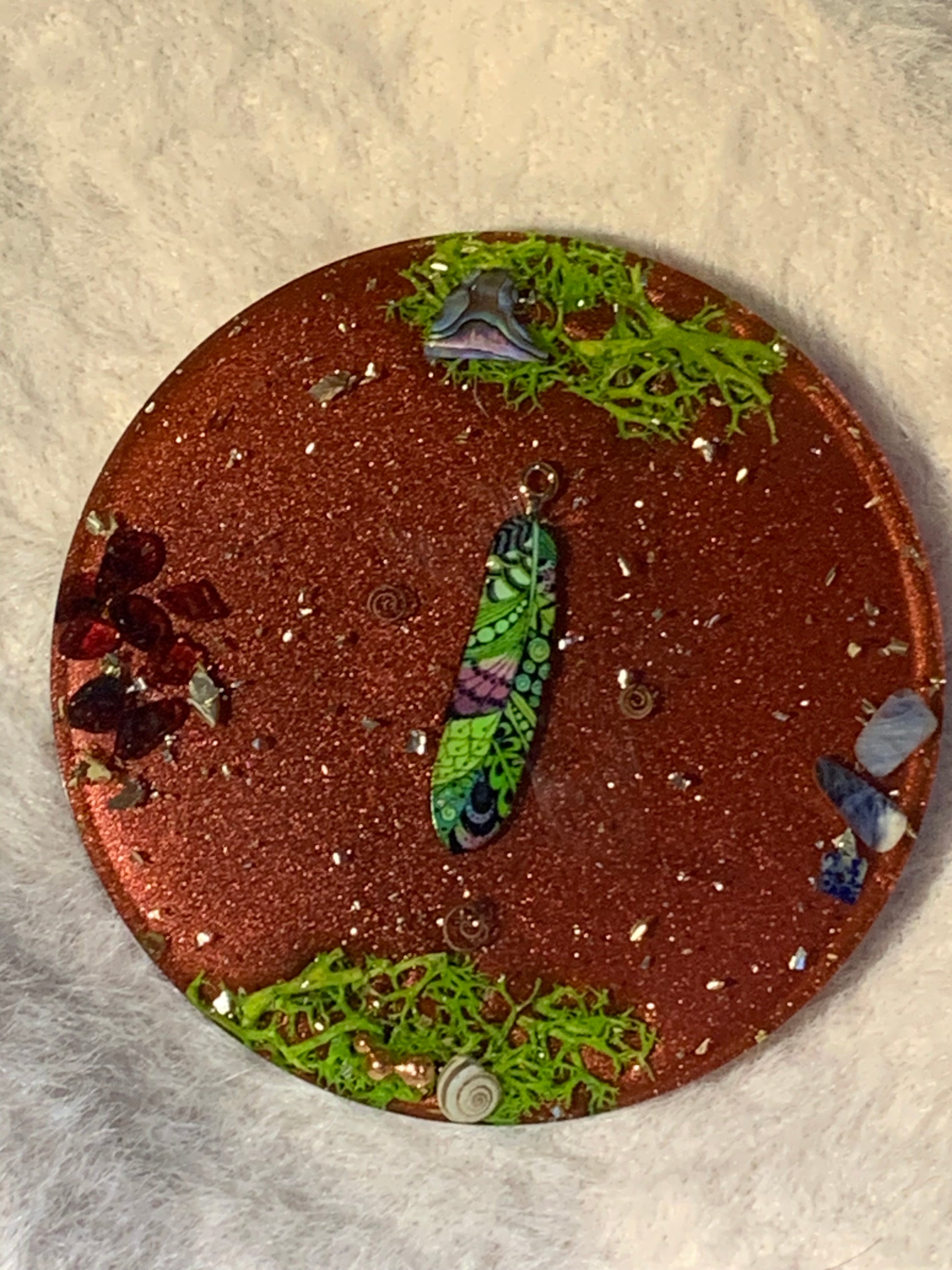 Deze orgonite brengt een harmonieuze mix van kracht en kalmte. Het pluim-teken symboliseert zuivering en nieuwe inzichten, terwijl granaat je energie en vitaliteit versterkt. Sodaliet bevordert innerlijke rust en helpt bij zelfexpressie, en de abalone shell voegt een element van sereniteit toe met haar zachte oceaanenergie. Perfect als energetische ondersteuning voor alledaagse rituelen.