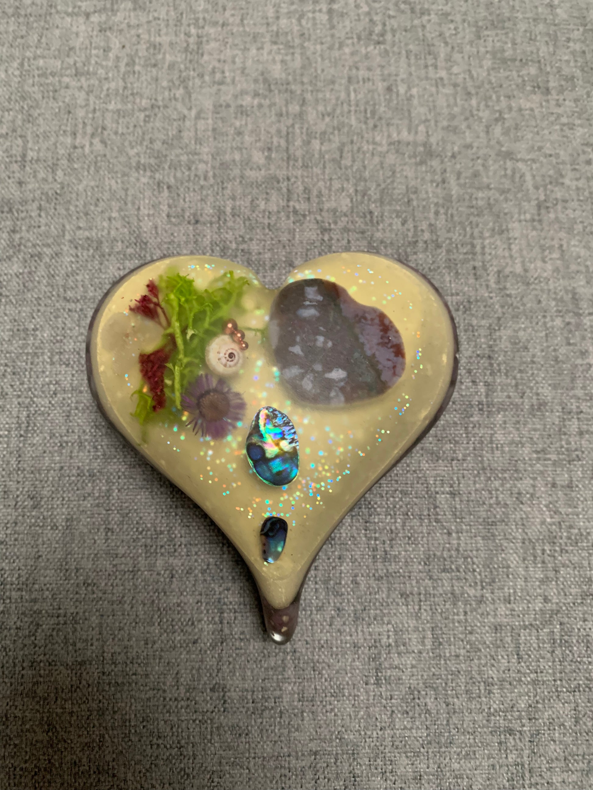 Deze hartvormige orgonite combineert de krachtige energieën van rode oceaan jaspis, abalone shell, lepidoliet, spiegel, koper, shungiet en zwarte toermalijn. De rode oceaan jaspis stimuleert passie en vitaliteit, terwijl de abalone shell en lepidoliet rust en harmonie brengen. De spiegel reflecteert negativiteit, waardoor het wordt omgezet in positieve energie. Koper versterkt de verbinding tussen de stenen, en shungiet en zwarte toermalijn bieden sterke bescherming tegen negatieve invloeden. Deze orgonite is een prachtig en krachtig hulpmiddel voor energieheling en balans.